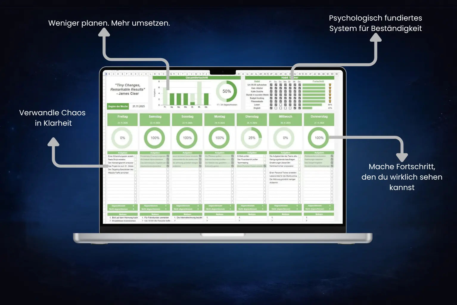 Du erhältst ein vollständiges Google Sheets & Excel System für Habit- und Aufgaben-Tracking.